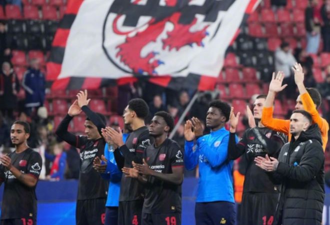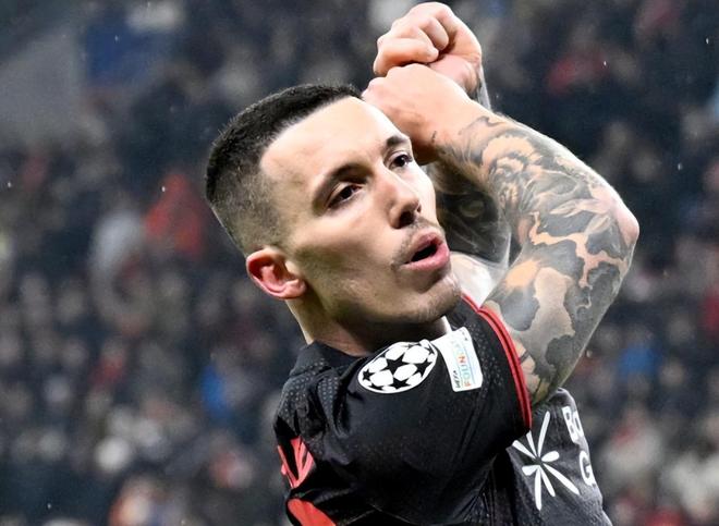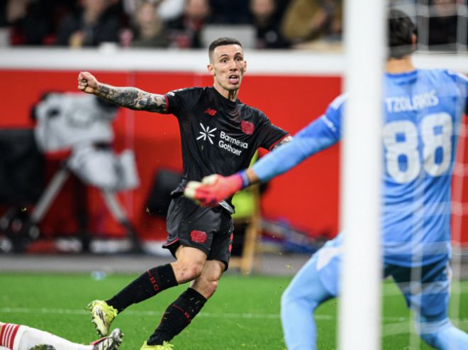 - 2026年02月25日 勒沃庫森0-0奧林匹亞科斯總比分2-0晉級歐冠16強 格里馬爾多中框